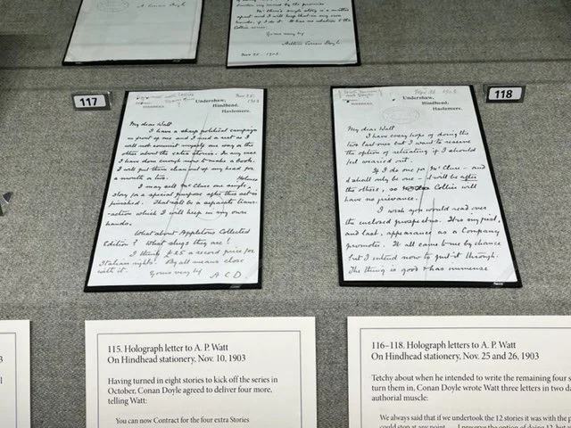 The exhibit was at the Grolier Club in Midtown Manhattan, and featured Holmes story drafts, original first editions, signed copies, and other memorabilia. Through these artifacts, I got to see the growth of both the Sherlock Holmes canon and the authorial life of Sir Arthur Conan Doyle. For example, the collection included these handwritten manuscript pages of The Hound of the Baskervilles: